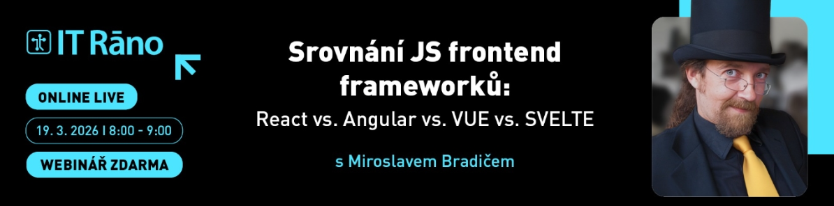 IT Ráno #48 | Srovnání JS frontend frameworků: React vs. Angular vs. VUE vs, SVELTE